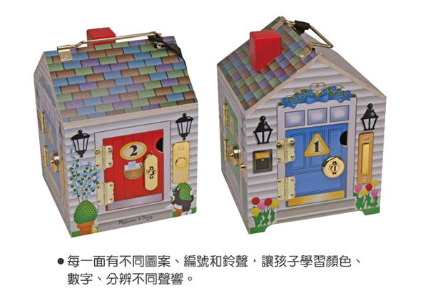 木製門鈴娃娃屋每一面有不同顏色、圖案、編號,讓孩子學習分辨色彩、圖像和數字,4面都有一道可開啟的門,每個門鎖有相匹配的獨特鑰匙,門上和鑰匙上有數字編號,讓孩子將數字配對,找出正確鑰匙,學習打開門鎖。