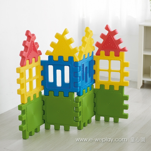- 四種不同種類、四種顏色的積木,能建構出造型特殊的童話王國。