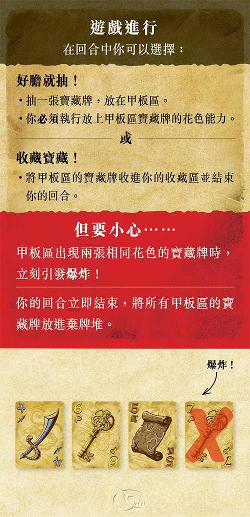 甲板區出現兩張相同花色的寶藏牌時,立刻引發爆炸!
