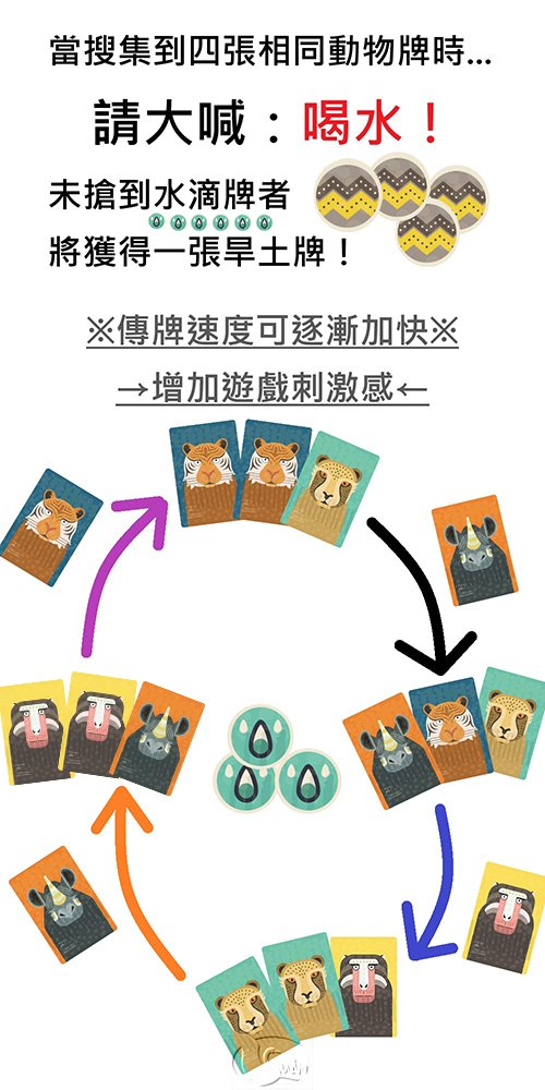 • 當有人收集到四張相同的動物牌時奪取桌上的水!