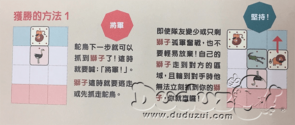 只要抓到對手的獅子,或者讓自己的獅子安全進入對手的地盤就算獲勝。