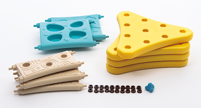 - 三角板的每個洞都可與寬板或窄板組合,螺帽旋轉組裝容易,可依活動目的變換不同組裝方式,如攀爬架、山洞、樓梯…等。
