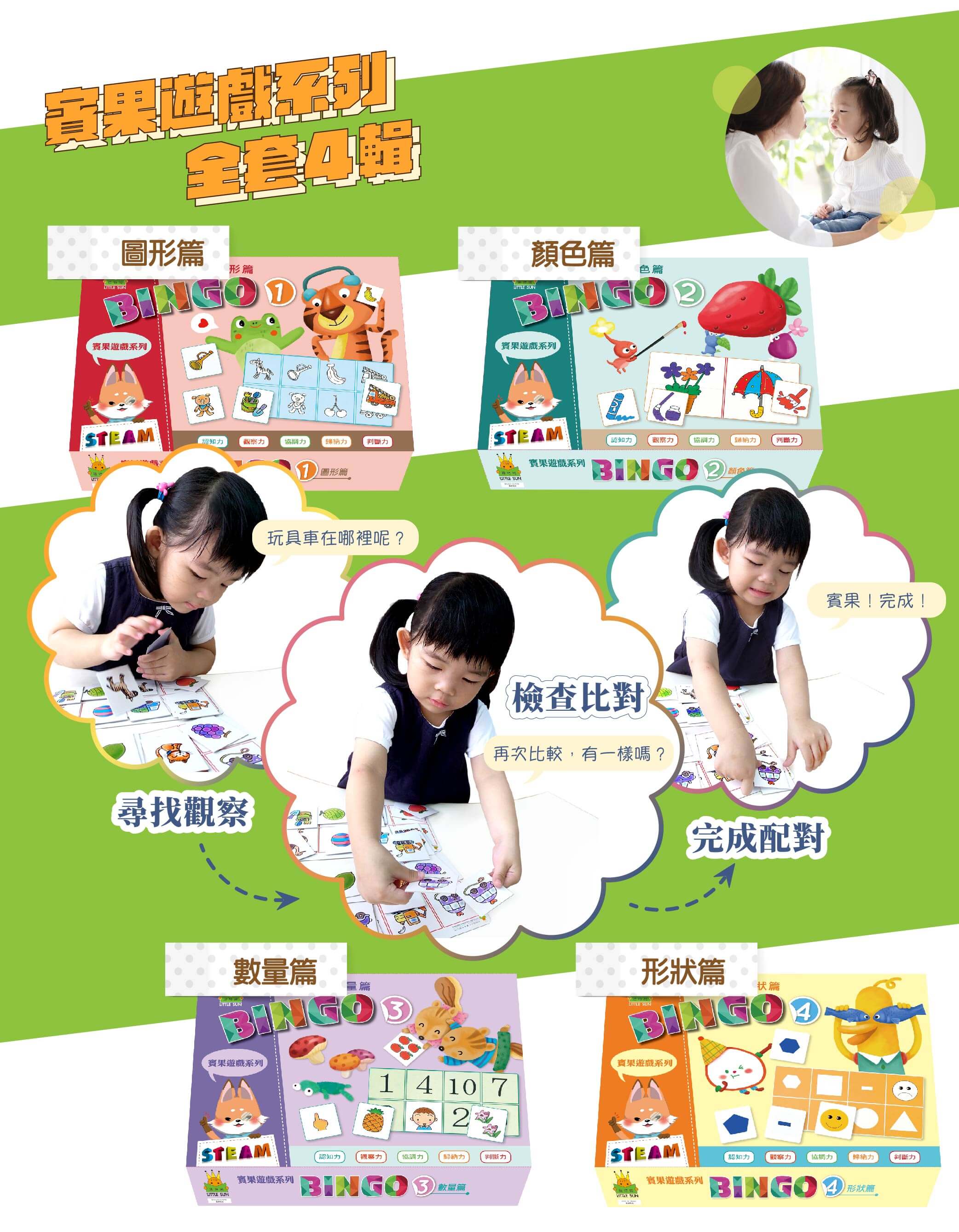 寶皇最喜歡玩的系列之一,可能因為賓果遊戲更有運氣和競賽感,讓他很投入呢!可以培養圖形、視覺辨視能力、增加認知配對力,遊戲中眼、手、腦三者並用。