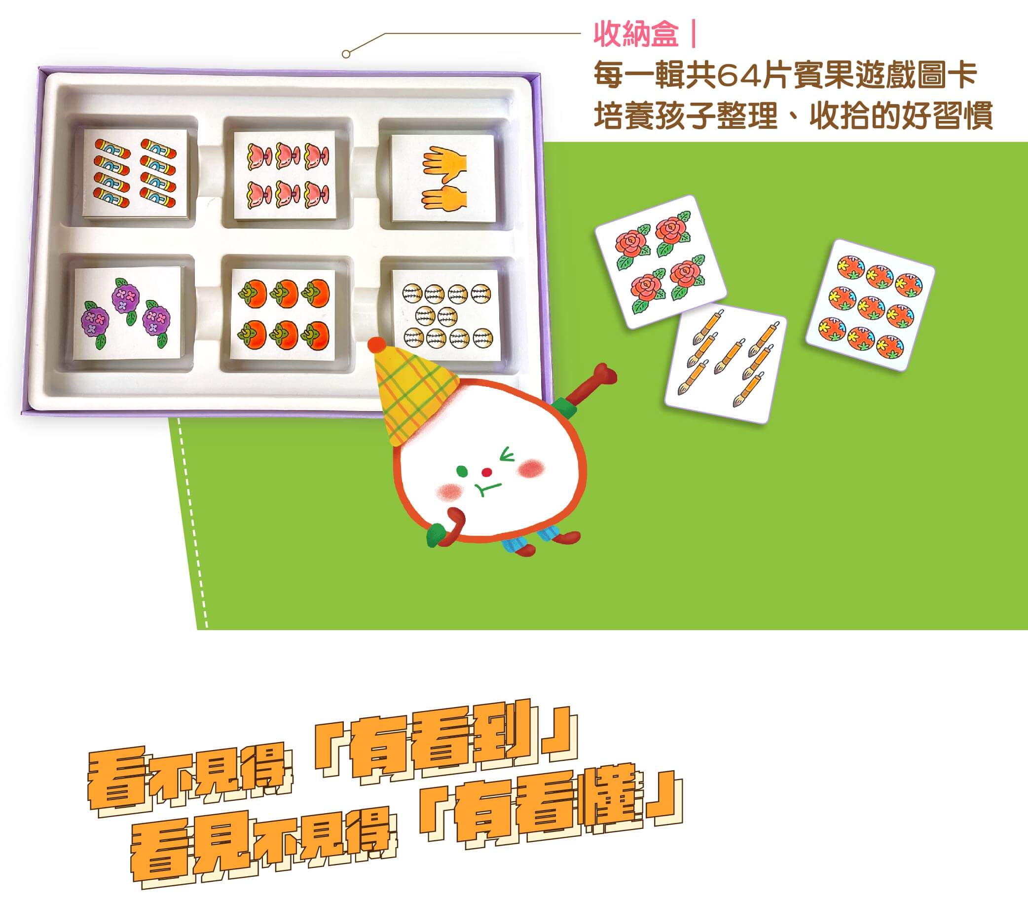 每輯有小卡片64張、大圖卡(雙面)8張、賓果遊戲手卡(雙面)32張