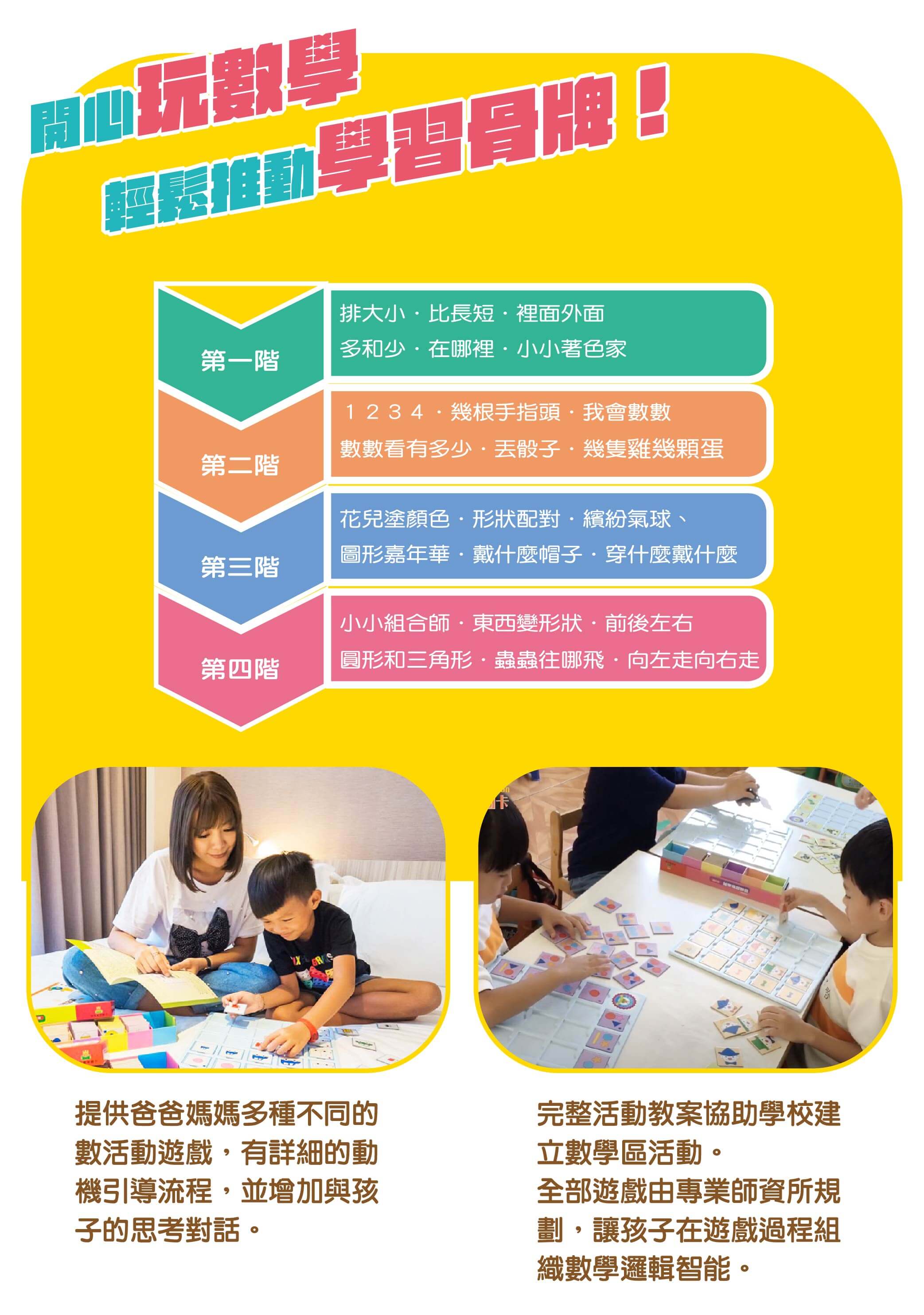 讓家中寶貝「學數學」,包括數字、數量的概念、圖形與空間、邏輯與關係四大領域,共4階段。