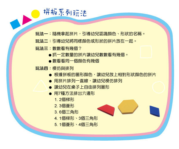 內含顏色亮麗的五片雙面拼板、47片幾何塑膠拼片與收納盒,其中拼板的雙面都有不同的動物圖形,可依照拼版圖案所搭配的嵌入式的幾何圖形,可讓寶寶學習將所對應的幾何木塊放入。