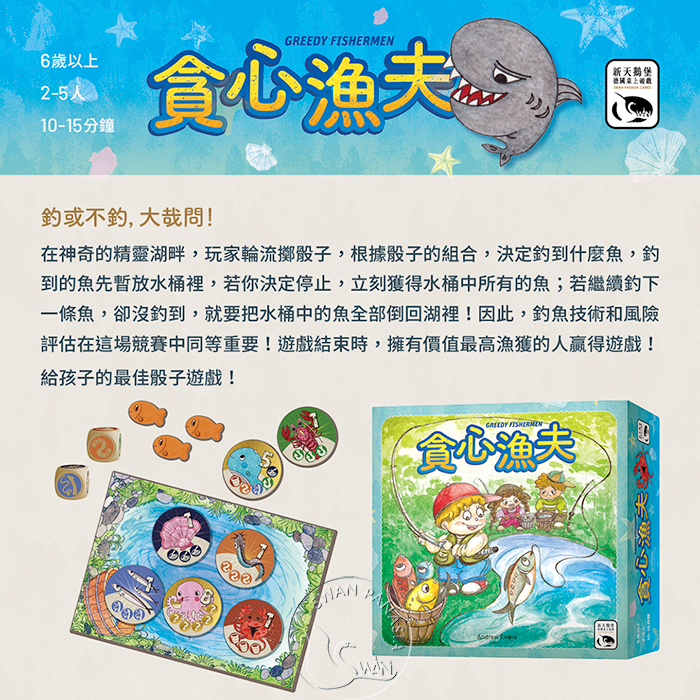 在神奇的精靈湖畔,玩家輪流擲骰子,根據骰子的組合,決定釣到什麼魚,釣到的魚先暫放水桶裡,若你決定停止,立刻獲得水桶中所有的魚;